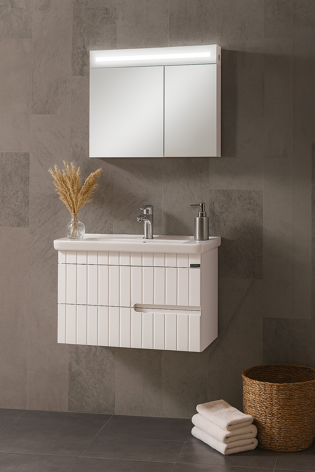 • Tasarım: Mat yüzeyli sade panel çizgileri ve kulpsuz tasarımı ile modern tarzı yansıtır. Üst kısımdaki ayna dolabı, geniş yansıtıcı yüzeyi ile hem ferahlık hissi yaratır hem de pratik kullanım sağlar.