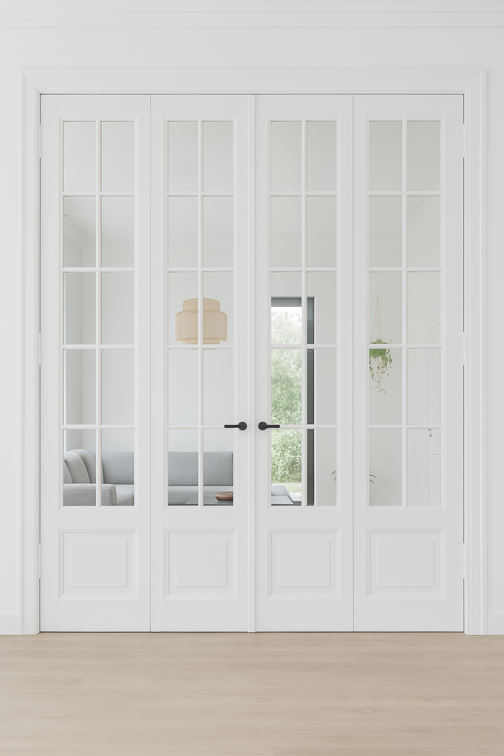 Her bir kanat, lake kaplama MDF çerçeve içerisine entegre edilmiş cam panellerle donatılmıştır. Bu yapı sayesinde hem iç mekanlar arasında görsel bir süreklilik sağlanır, hem de gün ışığının geçişiyle ortamlar daha aydınlık ve ferah hale gelir. Camlar isteğe göre şeffaf, buzlu, füme veya desenli olarak uygulanabilir.