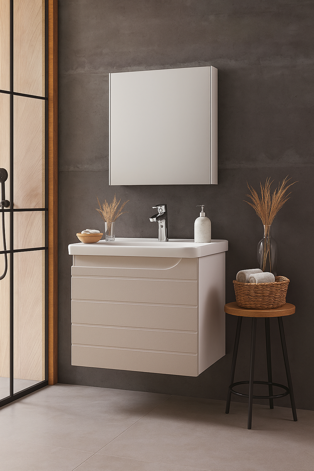 Tasarım: Mat yüzeyli sade panel çizgileri ve kulpsuz tasarımı ile modern tarzı yansıtır. Üst kısımdaki ayna dolabı, geniş yansıtıcı yüzeyi ile hem ferahlık hissi yaratır hem de pratik kullanım sağlar.